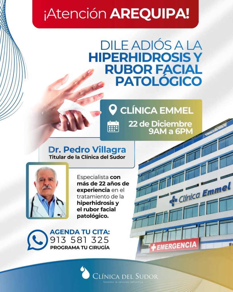 El Dr. Pedro Villagra estará atendiendo en la Clínica Emmel en Arequipa para tratar casos de Hiperhidrosis y rubor facial patológico.